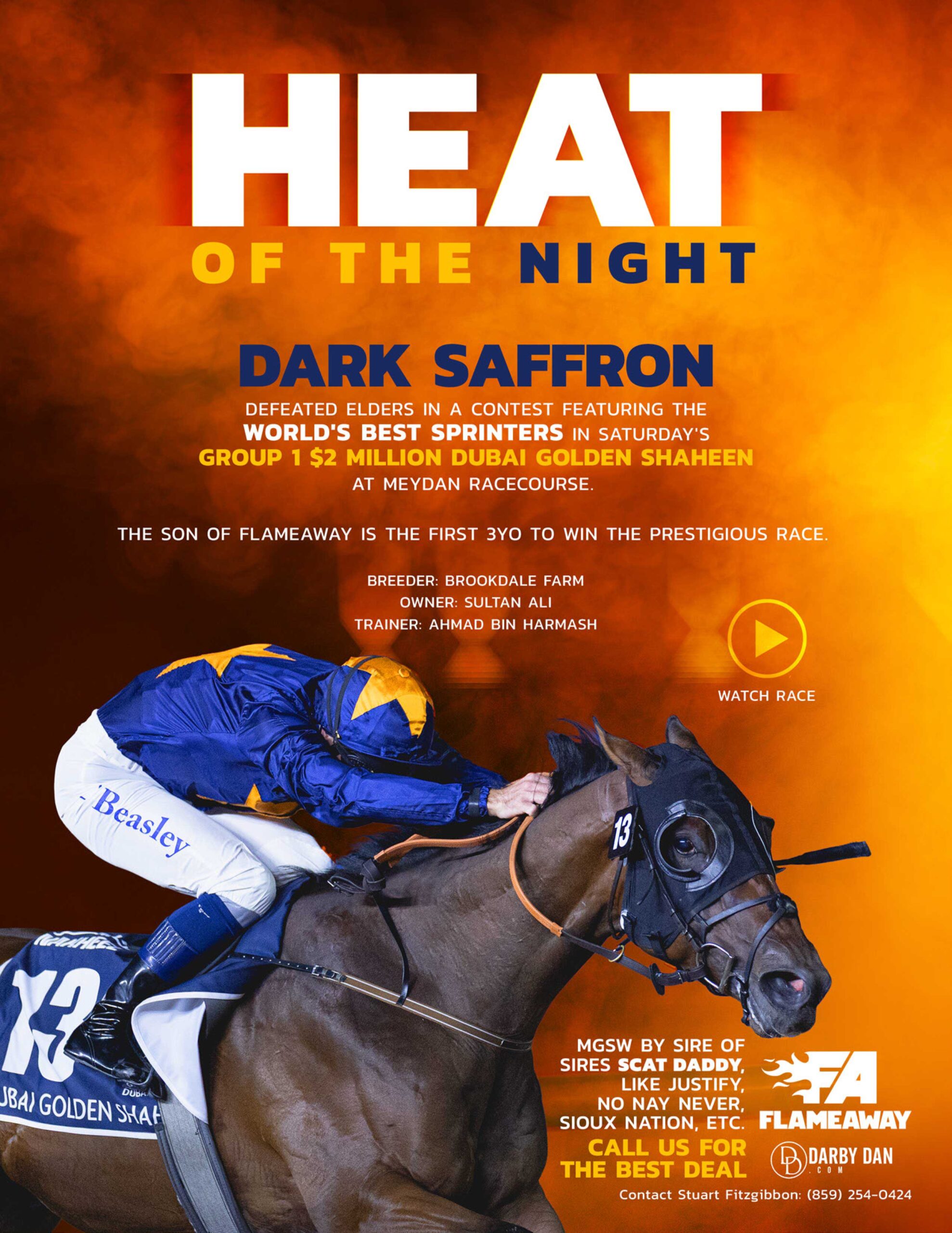 Dark Saffron collected his first stakes win in dramatic fashion in Saturday’s $2 million Dubai Golden Shaheen S. (G2), besting Nakatomi by a neck after a heated battle in the final furlong. The 3-year-old son of Flameaway was in the outside post in the field of 11,but made his way to the lead after the […]