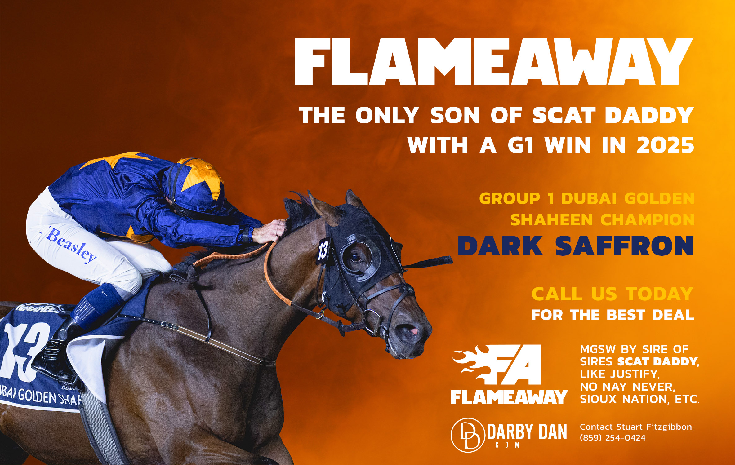 - 2025 racing includes Dubai Golden Shaheen (G1) winner DARK SAFFRON; Clasico Arturo Lyon Pena (CHI-G1) and Clasico Cotejo de Potrancas (CHI-G3) winner AMADA MILA; Kentucky Turf Sprint (G2) winner, $250,000 KY Downs Preview Turf Sprint S. winner and William Garret H. third BEAR RIVER; Clasico German Ruiz B (PAN-G2) winner and Clasico Oscar y Manuel Grimaldo (PAN-G2) winner FLIGHT MOON; Clasico Julio Subercaseaux Browne (CHI-G3) and Clasico Coronel Santiago Bueras winner and Clasico Cotejo de Potrancas (CHI-G3) runner-up REITHA; West Virginia Triple Crown Nutrition Breeders’ Classic S. winner and John McKee Memorial S. second EDY’S FLAME; Main Line S. winner and Beyond The Wire S. third BURNER ACCOUNT; Acadiana S. winner FAST FLAME; Limestone S. second DREAMAWAY; $150,000 Schuylerville S. second and $150,000 Bolton Landing S. third My Sweetheart; $100,000 Polynesian S. second and $100,000 Rumson S. third Northern Flame; Mine That Bird Derby second Wow That’s Hot; Clasico Seleccion de Potrillos (CHI-G3) and Clasico Raul Spoerer Carmona y Raul Spoerer Urrutia second Bacan Soltero; Blue Hen S. second Sassy Fox; $100,000 King Corrie S. second and $125,000 Woodstoke S. third Incoming; Musical Romance H. third Fantastic Flame; etc.
