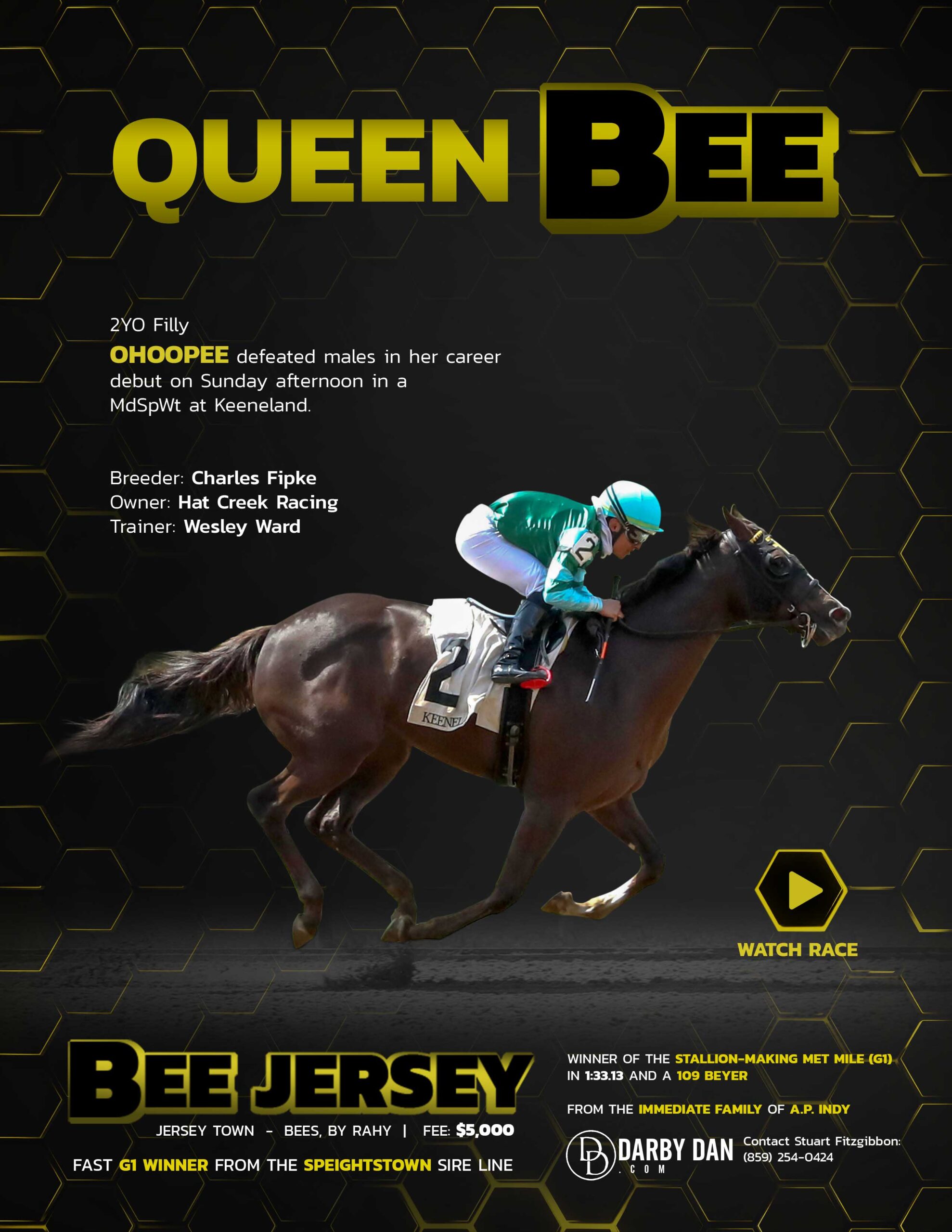 Winner of the Metropolitan Handicap (G1) with a 109 Beyer Speedfigure, Bee Jersey is a brilliant miler from Speightstown sire line, and from the family of A.P. Indy.