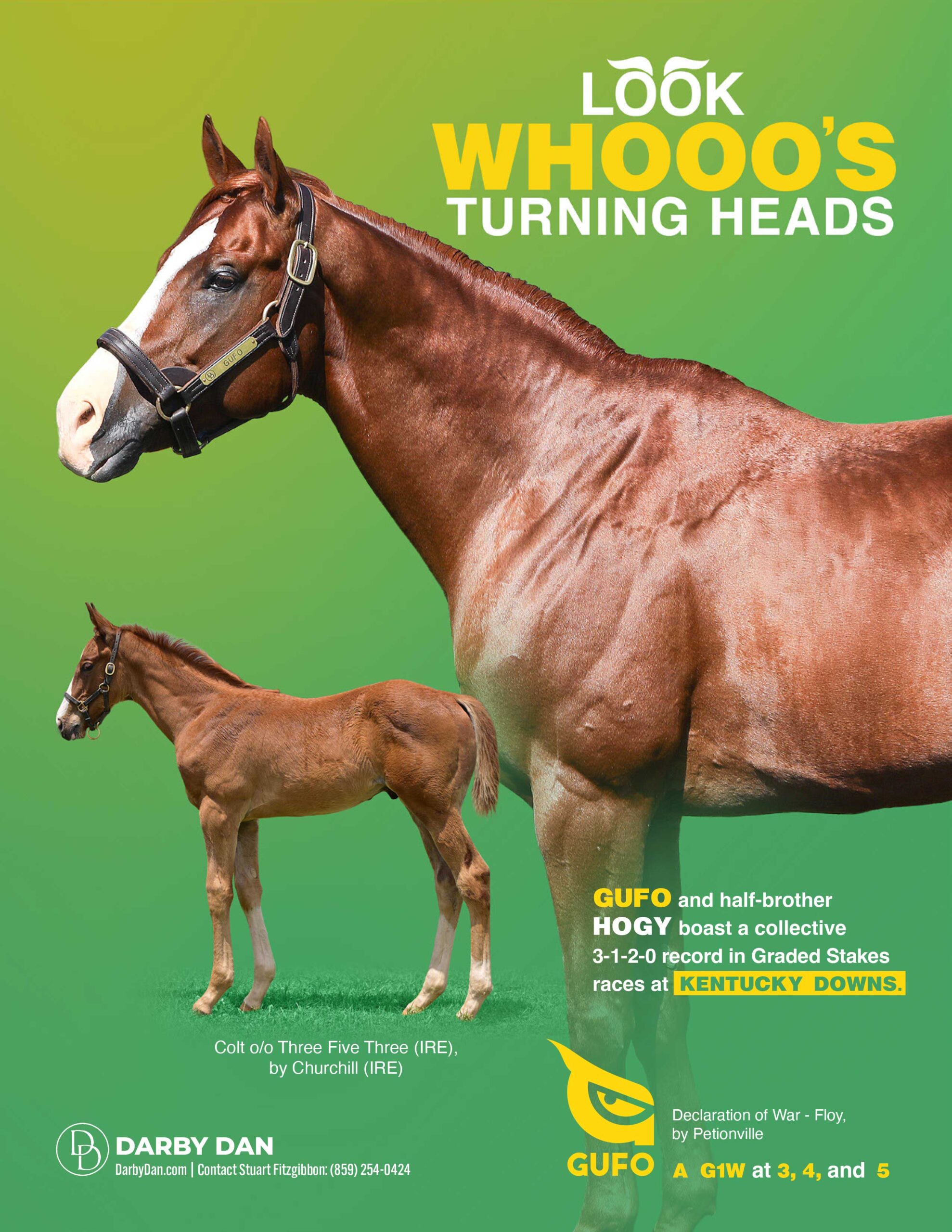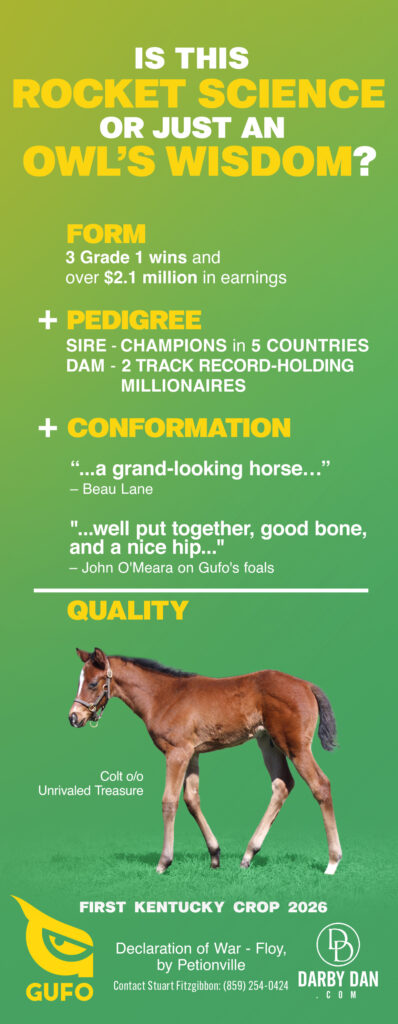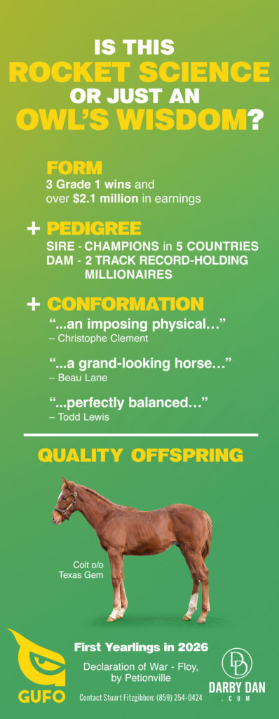 Darby Dan Farm’s Gufo, a Grade 1 winner at three, four, and five, and a son of Declaration of War, sired his first reported foal on Friday, Jan. 24…