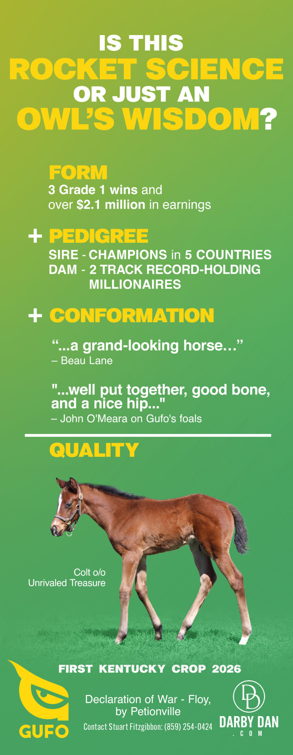 An earner of over $2,000,000, Gufo won seven black-type events, five graded and three grade one, and earned places in seven other graded contests, six grade one. By European Horse of the Year, Declaration of War, the leading sire son of War Front, Gufo is half-brother to the multiple graded stakes winning millionaire Hogy. He is from the immediate family of Leading Sire Broad Brush and Champion Two-Year-Old and twice Leading Sire of Two-Year Olds Capote.
