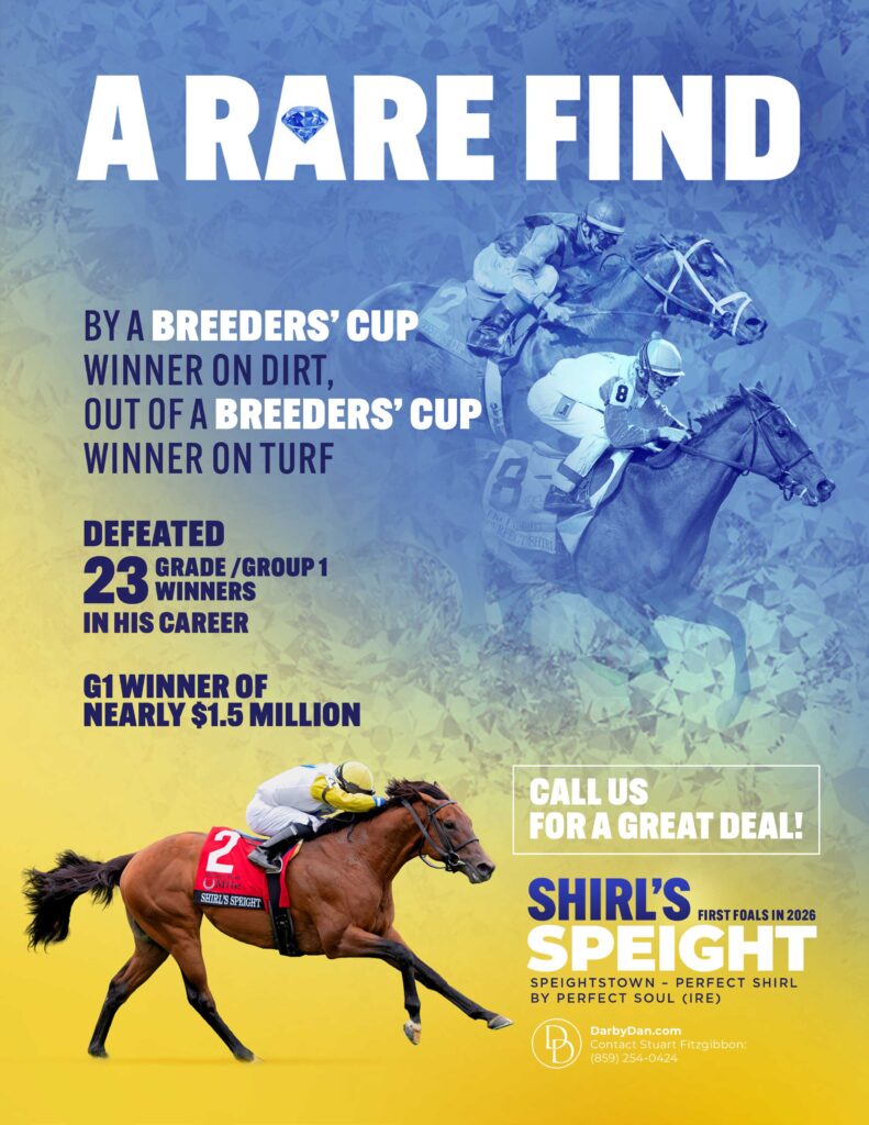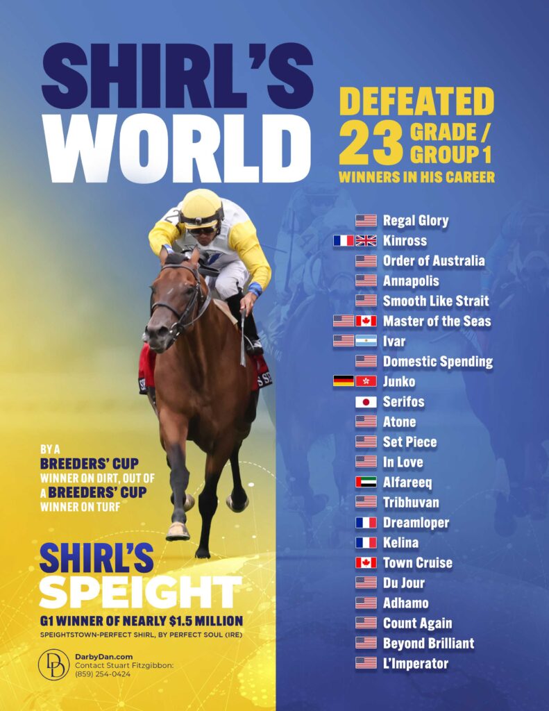 A grade one winning miler, Shirl’s Speight is by Champion Sprinter and sire of sires, Speightstown, and has a grade one winning first and second dam.