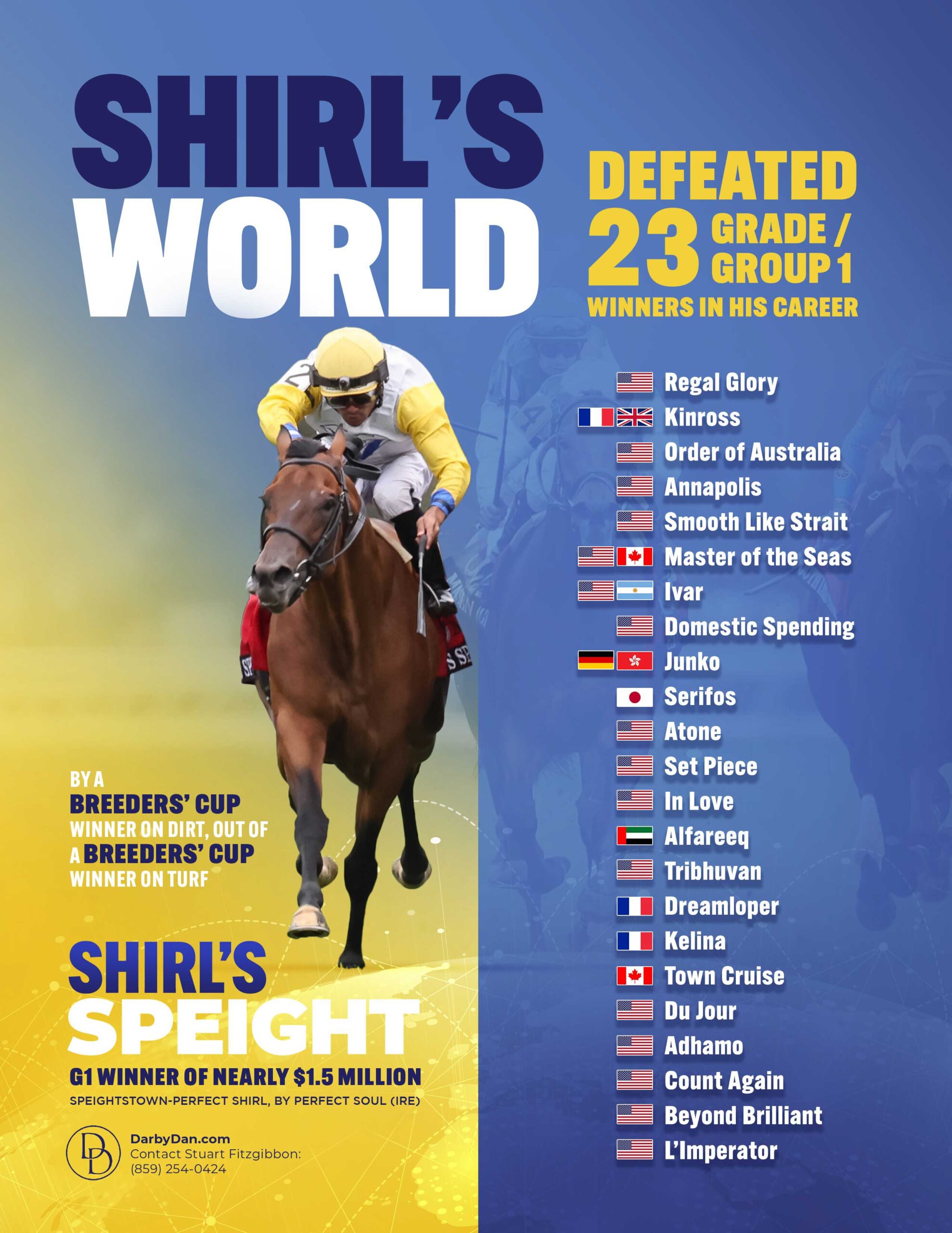 • His Champion sire Speightstown won the 2004 Breeders’ Cup Sprint (G1) and his dam Perfect Shirl was the winner of the Breeders’ Cup Filly and Mare Turf (G1) in 2011.